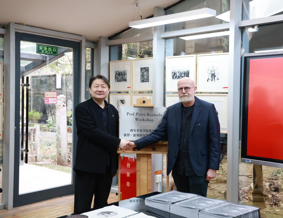 4月2日,彼得·博斯蒂尔教授工作室授牌仪式在学校版画系国家级实验室举行。院长朱尽晖、比利时安德卫普皇家艺术学院版画系主任彼得·博斯蒂尔出席揭牌仪式。